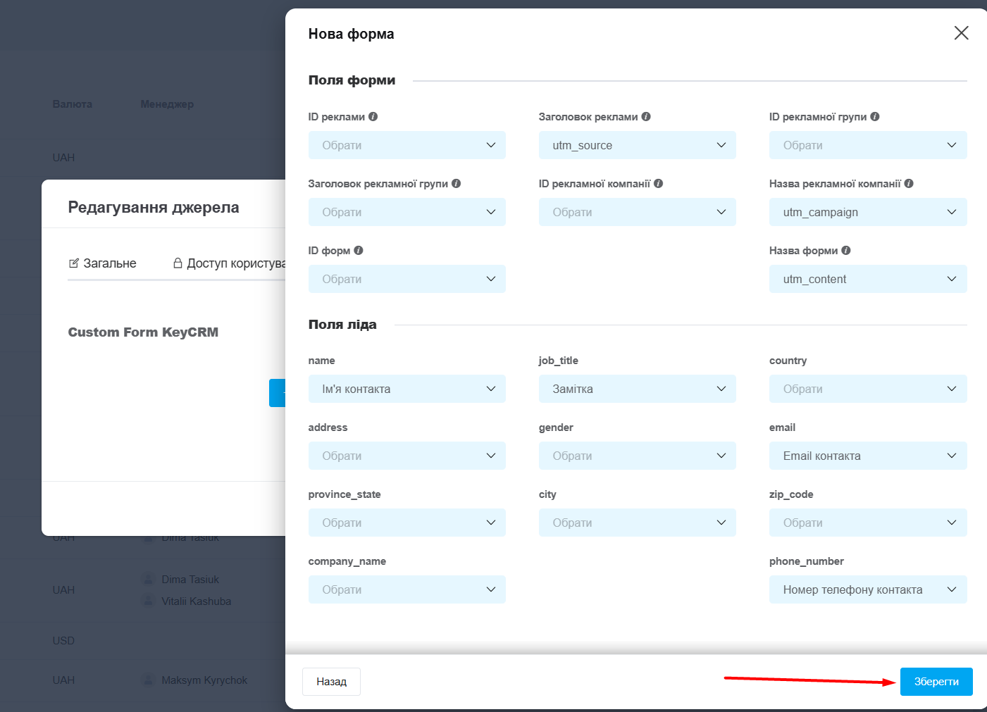 Чтобы передавать данные с лид-формы в KeyCRM, нужно указать, какие поля формы соответствуют полям в keyCRM.