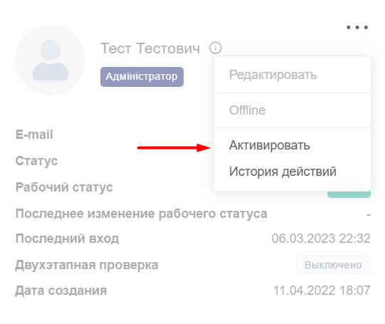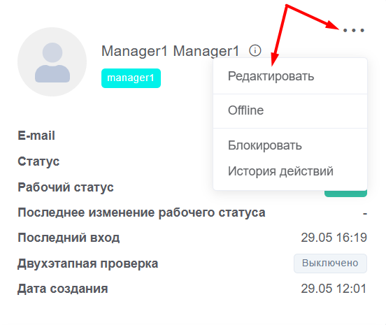 В карточке пользователя, нажмите на 3 точки и редактировать, если необходимо изменить имя, логин, почту, роль, телефон или изображение.