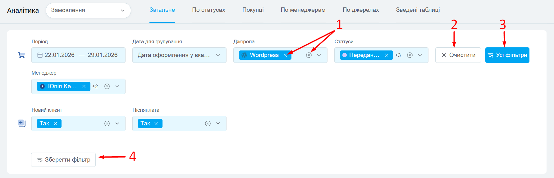 Фільтри дозволяють швидко налаштувати вибірку даних за потрібними параметрами. Доступні дії: