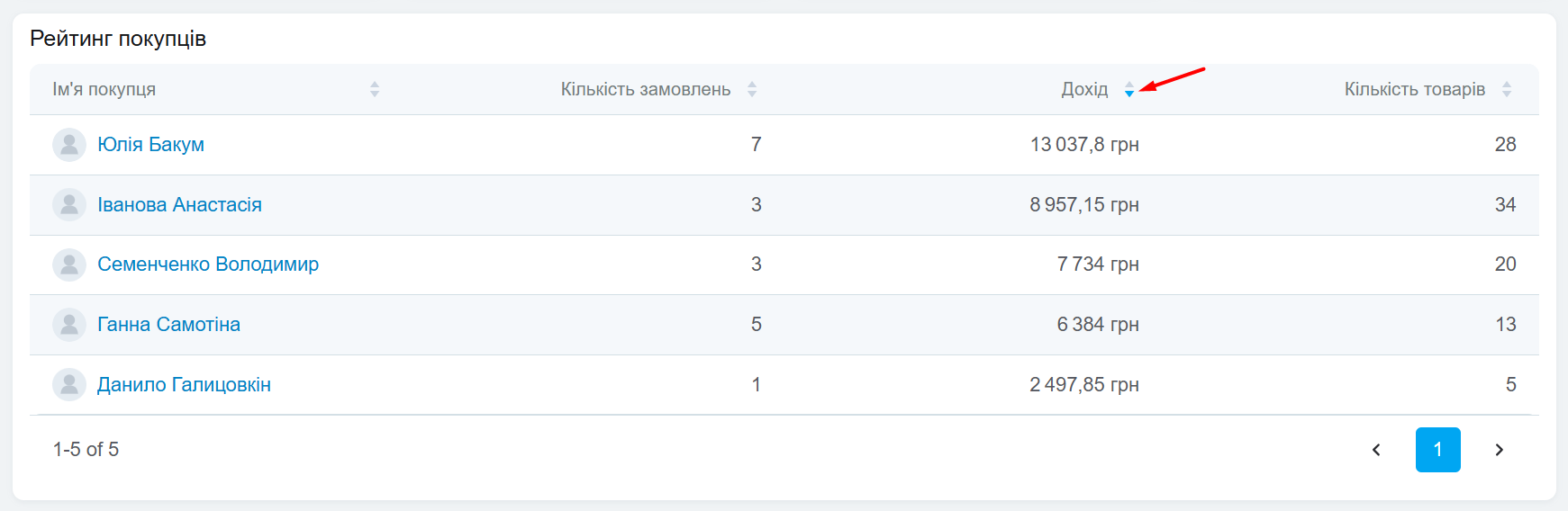 В розділі відображається список покупців за обраний період з основною інформацією по кожному з них: