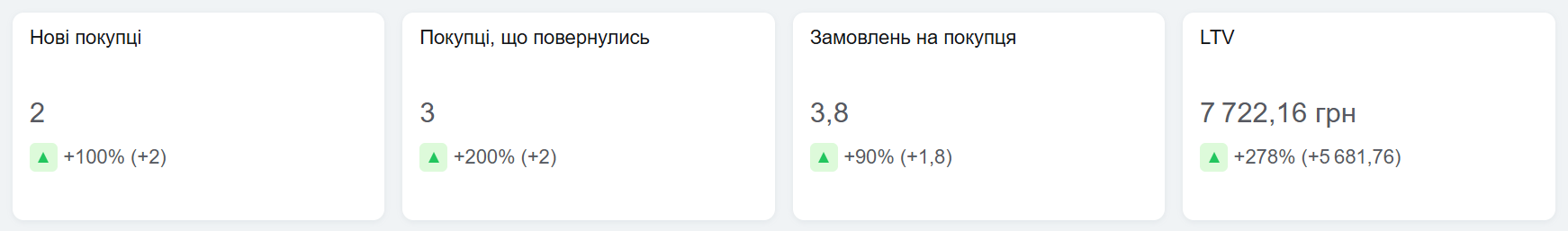 - покупці, що повернулись — кількість покупців, які оформили замовлення в обраному періоді, але були створені та робили замовлення до цього періоду;