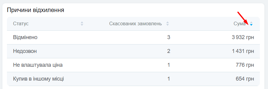 Відображає кількість та загальну суму скасованих замовлень по кожному статусу скасування окремо. По колонках можна робити сортування: