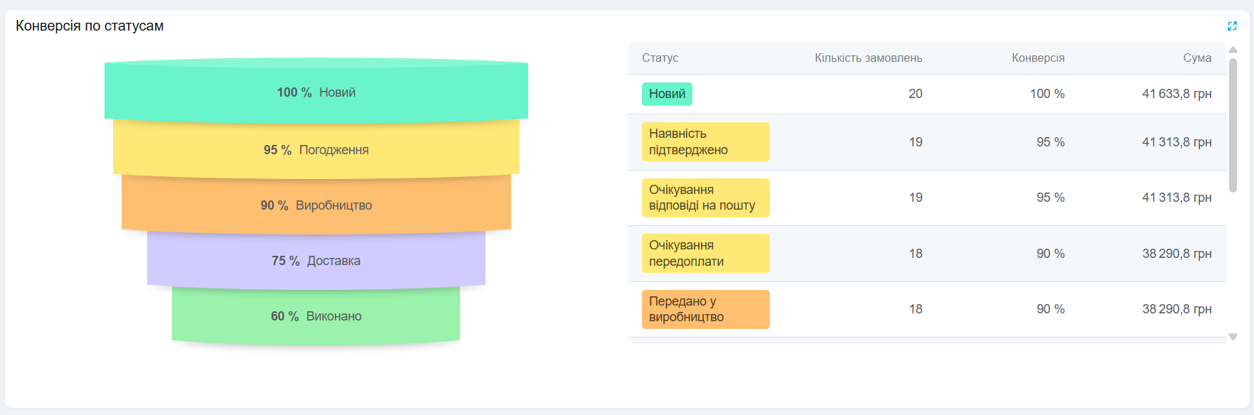 Також якщо замовлення було переведено зі статусу «Новий» одразу до «Виконано», то кількість замовлень буде додана до кожного статусу в конверсії.