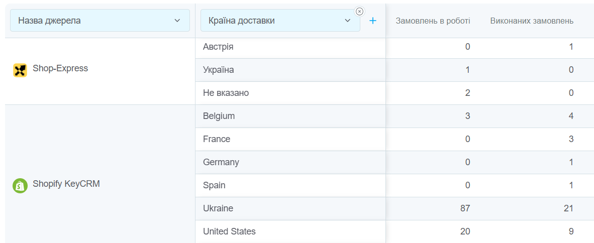 - Дізнатися з яких країн по кожному джерелу найбільше замовлень. У першій колонці вибираємо критерій «Назва джерела», а в другій «Країна доставки»: