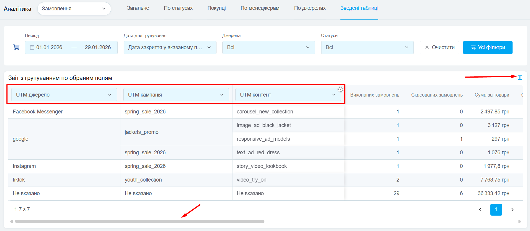 Перейдіть до розділу «Аналітика» → «Замовлення» → «Зведені таблиці» та оберіть потрібні фільтри.