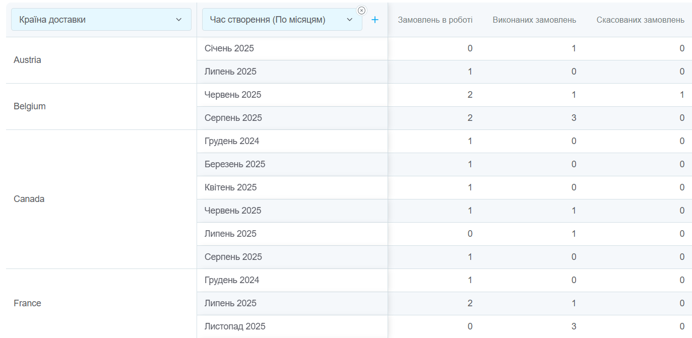 - Дізнатися сезонність кожної країни. У першій колонці вибираємо критерій «Країна доставки», а у другій «Час створення (По місяцям)»: