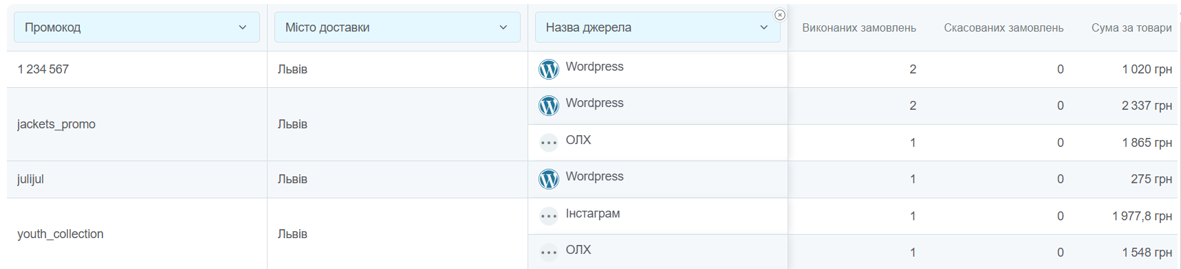 - Дізнатися про ефективність акцій по промокодах. Можна комбінувати з іншими критеріями, наприклад, містами чи областями: