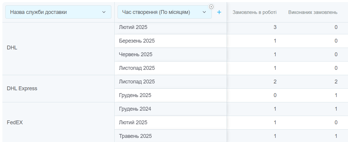 - Дізнатися найпопулярніші служби доставки та обсяги відправок по них, щоб домовитися про найкращі умови. У першій колонці вибираємо критерій «Назва служби доставки», а у другій «Час створення (По місяцям)»: