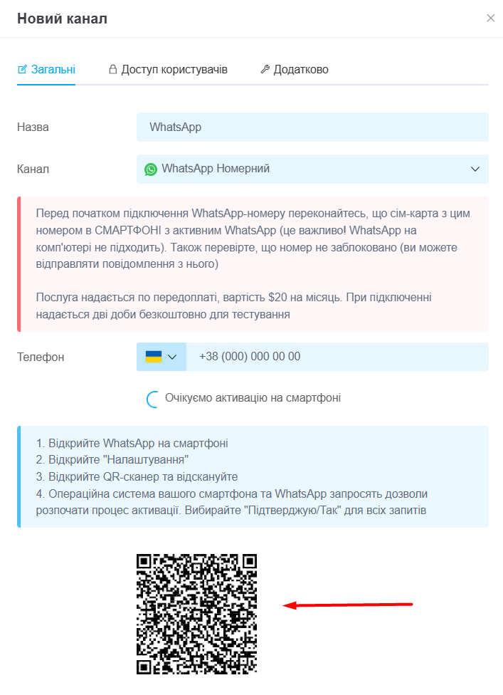 З'явиться qr-код, який потрібно відсканувати в мобільному застосунку WhatsApp з цим номером: