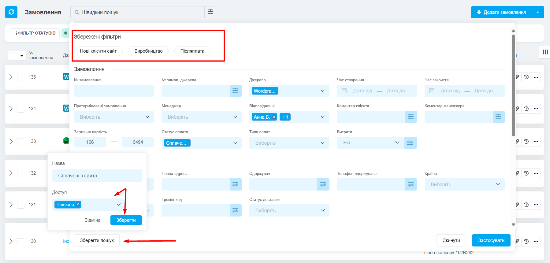 Якщо ви часто обираєте однакові фільтри для пошуку замовлень, то можете зберігти їх як шаблон. Можна створити шаблони пошуку для себе та інших користувачів: