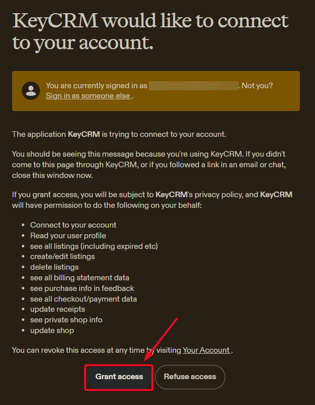 3. Натисніть на «Авторизуватися», введіть ваш логін і пароль від кабінету Etsy та підтвердьте підключення, натиснувши на «Allow Access»: