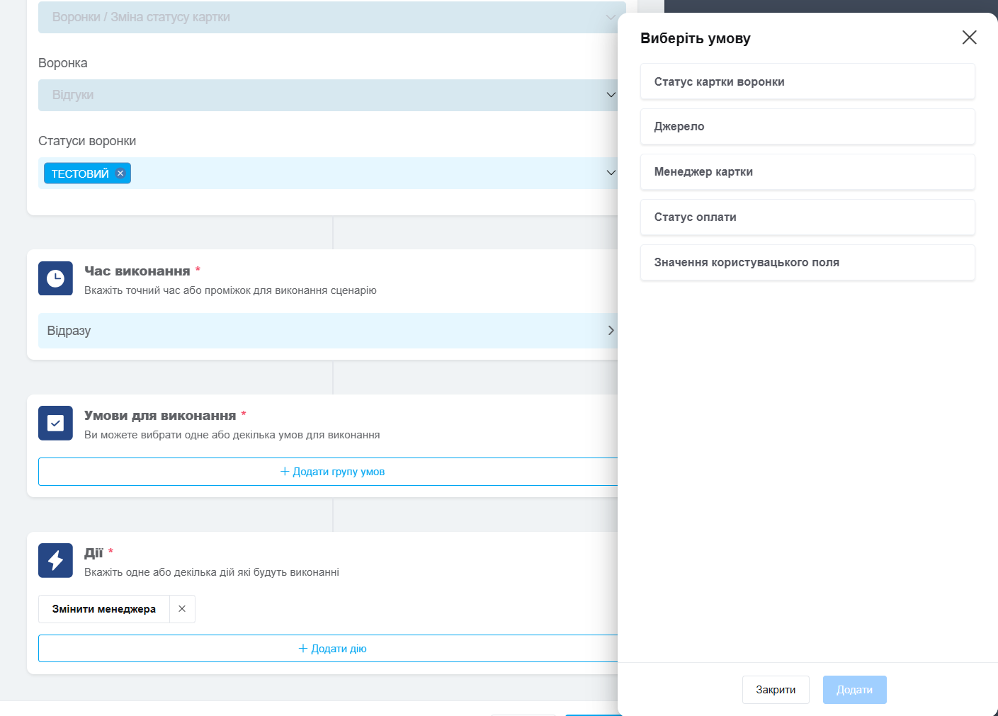 • Умови для виконання: встановіть умови, щоб тригер перевірив чи підходить картка воронки в якому спрацювала подія для виконання тригера;