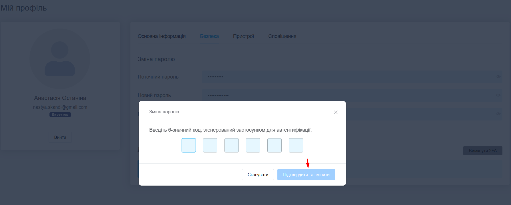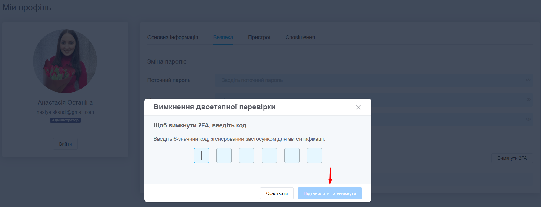 2. Далі введіть код із застосунку Google Authenticator та натисніть «Підтвердити».