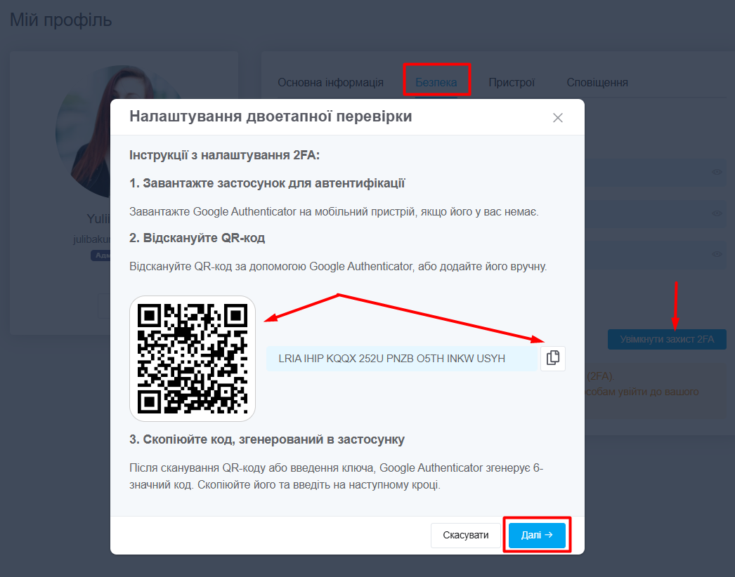 2. У CRM перейдіть у «Мій профіль»вкладка «Безпека» та натисніть «Увімкнути захист 2FA» (з'явиться вікно з QR-кодом);