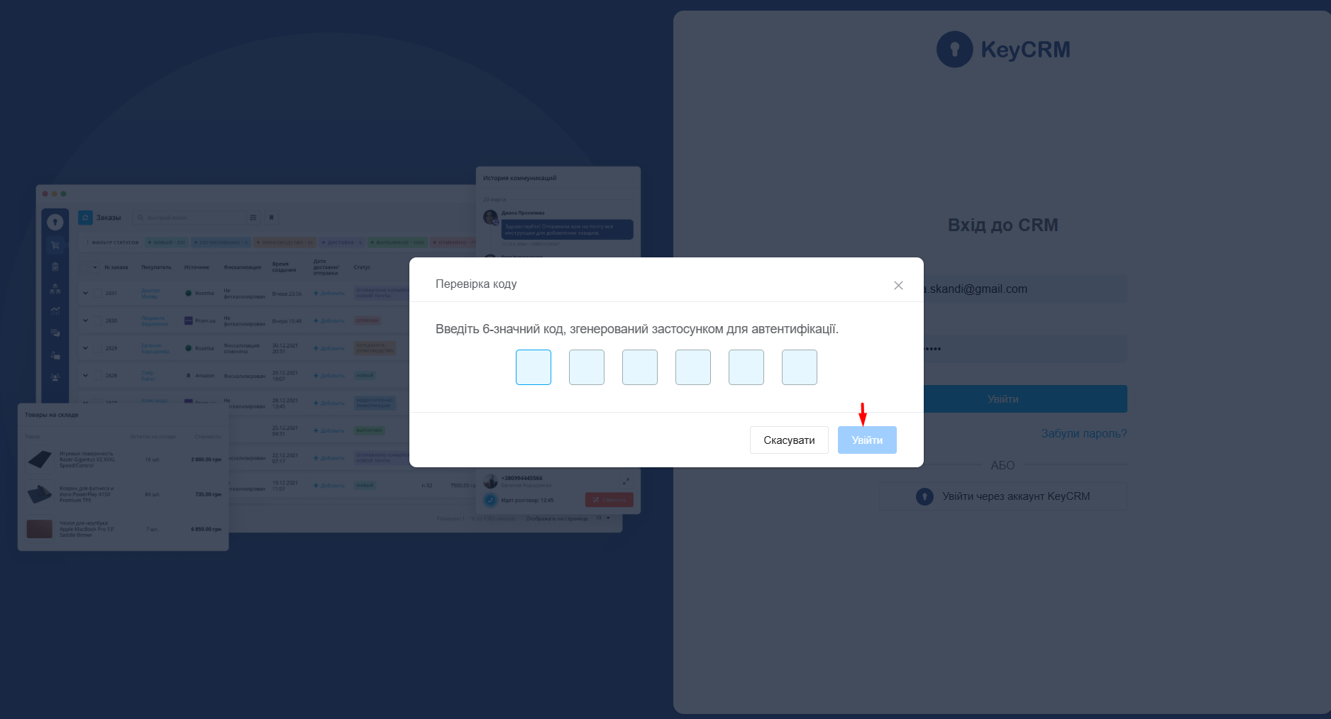 4. У CRM натисніть «Далі», введіть 6-значний код із додатку та натисніть «Підтвердити».