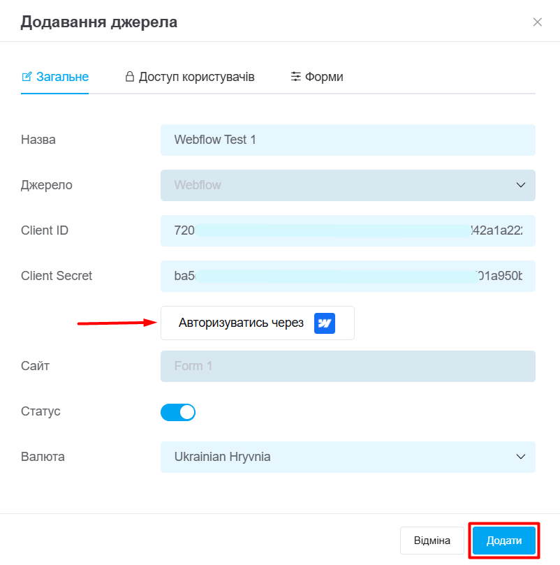 - Сайт — після авторизації, оберіть сайт зі списку, заявки з форм якого необхідно підключити;