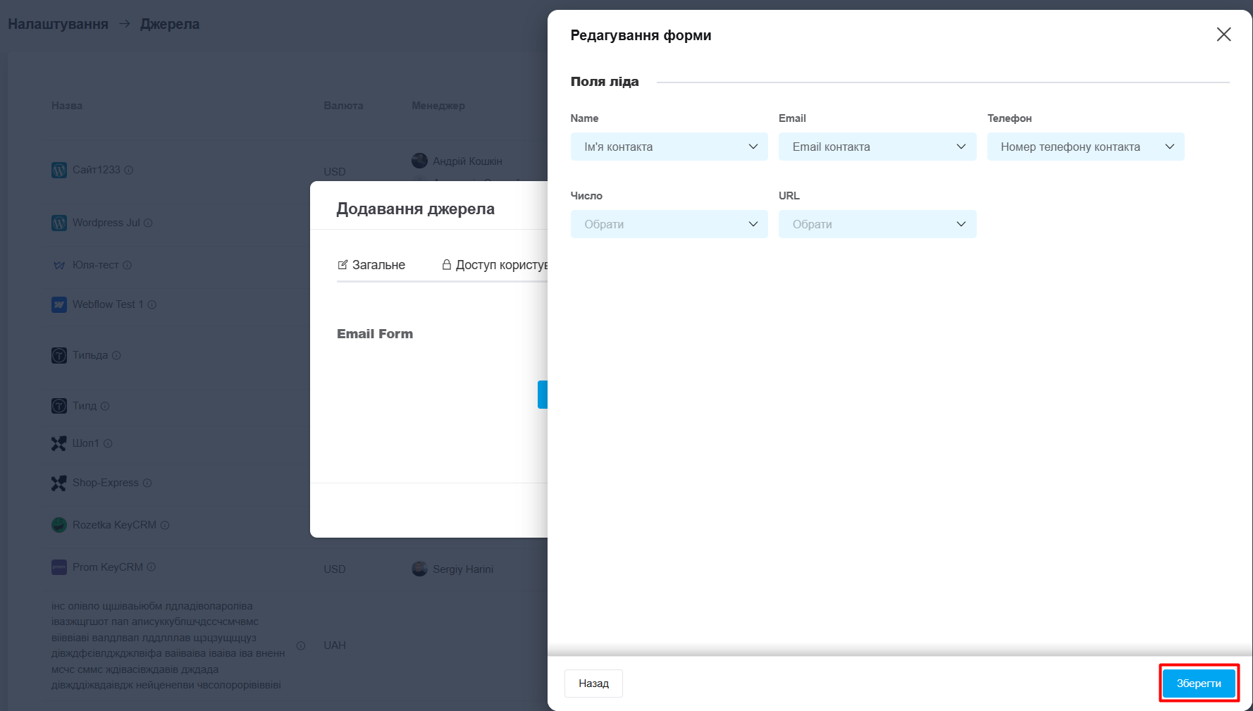 У вікні завантажаться всі поля обраної вами форми, виберіть їм відповідність полів у keyCRM і натисніть «Зберегти».